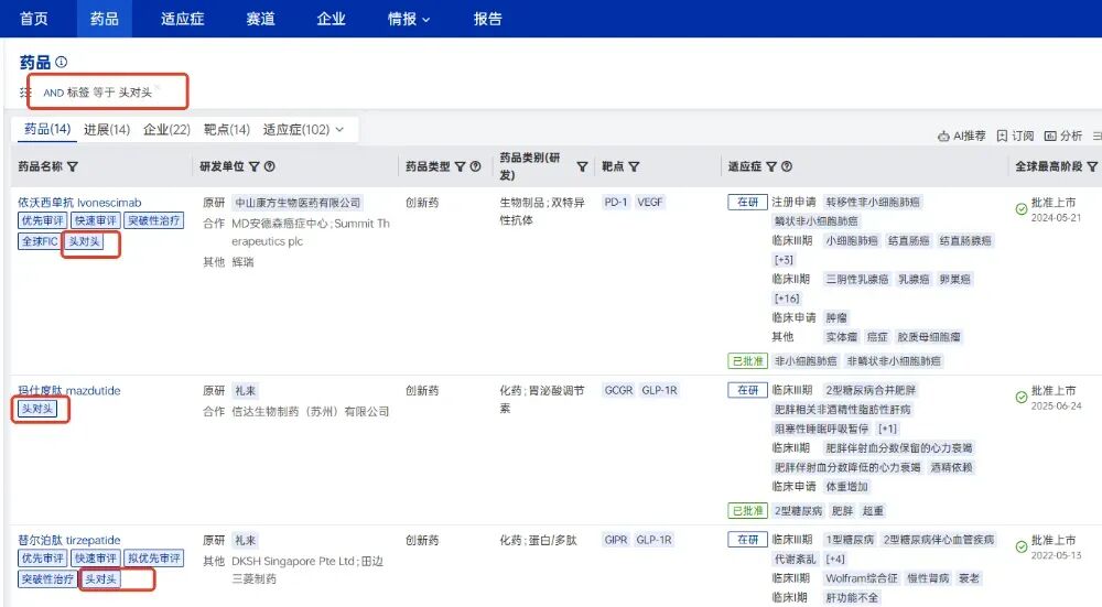 头对头试验(Head-to-Head Trial)是创新药临床试验中一种直接比较两种或多种治疗方法的试验设计,通常以已上市的标准治疗药物(阳性对照)作为对照组,以证明新药的优势,兼具科学严谨性与商业战略意义。根据全球药物分析系统数据库统计,截止目前共有14个药品项目有做过头对头试验,包括中山康方的依沃西单抗(Ivonescimab)“头对头”挑战K药、礼来的玛仕度肽(mazdutide)“头对头”挑战司美格鲁肽以及冠科美博的贝莫苏拜单抗 (benmelstobart)“头对头”挑战替雷利珠单抗等等。通过全球药物的特色标签功能,可以迅速查询到相关做过“头对头”实验的项目