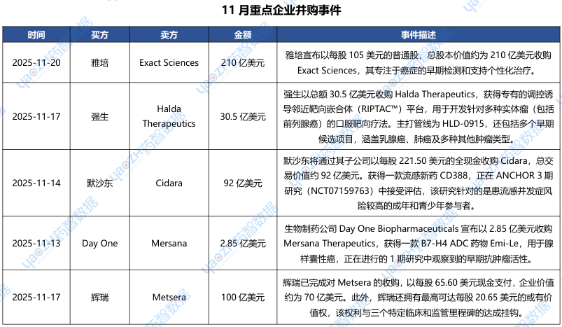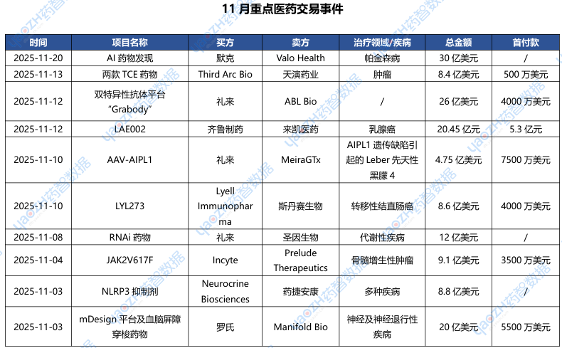据市场投资格局统计,2025年11月共175条医药交易事件、163条医药投融资事件和22项企业并购事件发生,重点交易信息如下,完整清单详见市场投资格局数据库。