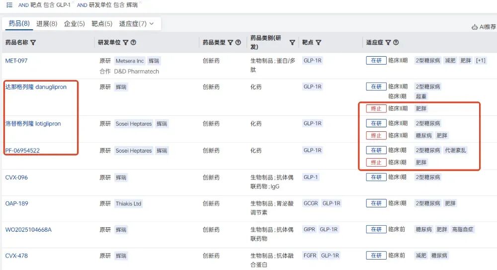 辉瑞减肥赛道终止项目(数据来源:药智新版全球药物分析系统数据库)
