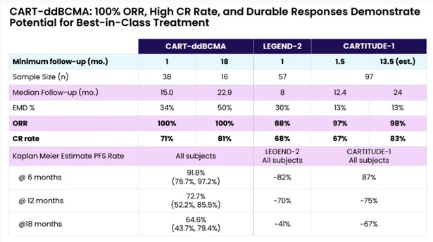 核心产品anito-cel的临床数据某些指标一度超越传奇生物的西达基奥仑赛。西达基奥仑赛的两项早期临床试验LEGEND-2和CARTITUDE-1在公布时,已经激起了巨大的反响,但是和anito-cel对比,除了CARTITUDE-1试验24个月随访时的CR率要领先一些外,其余的数据都是anito-cel更优。