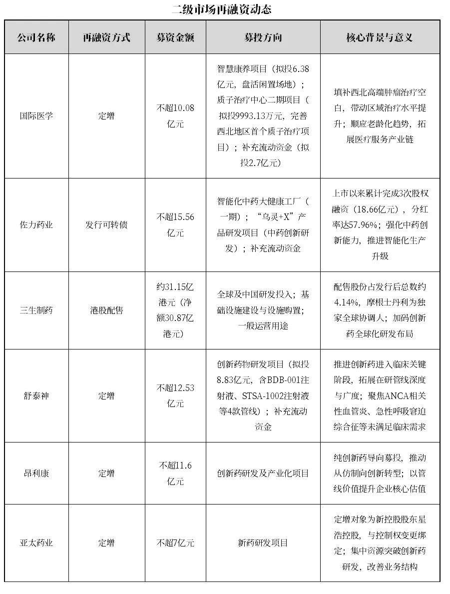 2025年12月1日至5日,中国生物医药领域延续高活跃态势,融资聚焦肿瘤免疫、创新药研发等核心赛道,再融资成为A股药企补充资金、推进项目的重要手段。同时,政策端生物制造新政落地,行业端流感疫情推动相关细分领域需求上升,创新管线加速推进,整体呈现“融资与再融资并行、政策与市场双驱动”的特点。以下为上周融资动态、行业政策及市场趋势的全面分析。