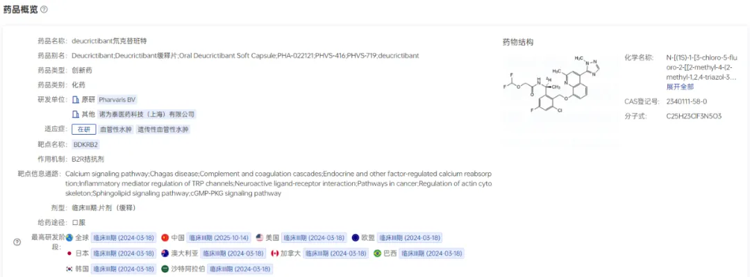 Pharvaris公司开发的deucrictibant也是一种缓激肽B2受体拮抗剂。其优势在于,该药是一种精心设计的氘代小分子口服药物,这是目前唯一处于临床开发阶段的口服缓激肽B2受体拮抗剂。