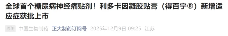 12 月 9 日,中国生物制药宣布,旗下泰德制药自主研发的利多卡因凝胶贴膏(商品名:得百宁®)新适应症获批上市,用于缓解糖尿病性周围神经病理性疼痛(DPNP)治疗,成为全球首个、国内唯一获批 DPNP 治疗的贴剂药物。