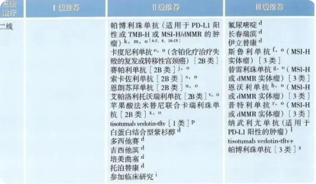 从2025年的CSCO给出的宫颈癌诊疗指南来看,目前手术切除后复发宫颈癌的系统性治疗手段仍然是有限的。目前一线治疗方案非常传统,I级推荐方案仍然是贝伐珠单抗+化疗,II级推荐会加入K药或者卡度尼利。