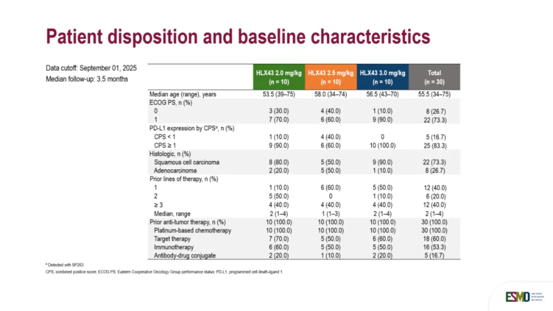 我们来看ESMO Asia披露的数据:患者基线如下图所示,我们可以看到三个亚组中,此前接受三线及以上治疗的患者都达到了40%,其中3mg/kg组的患者既往中位治疗线数为2。