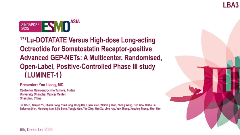 “镥[177Lu]氧奥曲肽对比高剂量长效奥曲肽治疗生长抑素受体阳性的晚期胃肠胰神经内分泌瘤的III期临床研究”的期中分析结果入选大会“最新突破性摘要(LBA)”。12月6日,复旦大学附属肿瘤医院梁赟教授在大会现场对该研究结果进行了报告。结果显示[2],在2024年1月至2025年5月期间,共有209例患者被随机分组。基于盲态独立评审委员会(BICR)评估,镥[177Lu]氧奥曲肽组的中位无进展生存期(PFS)尚未达到(95%