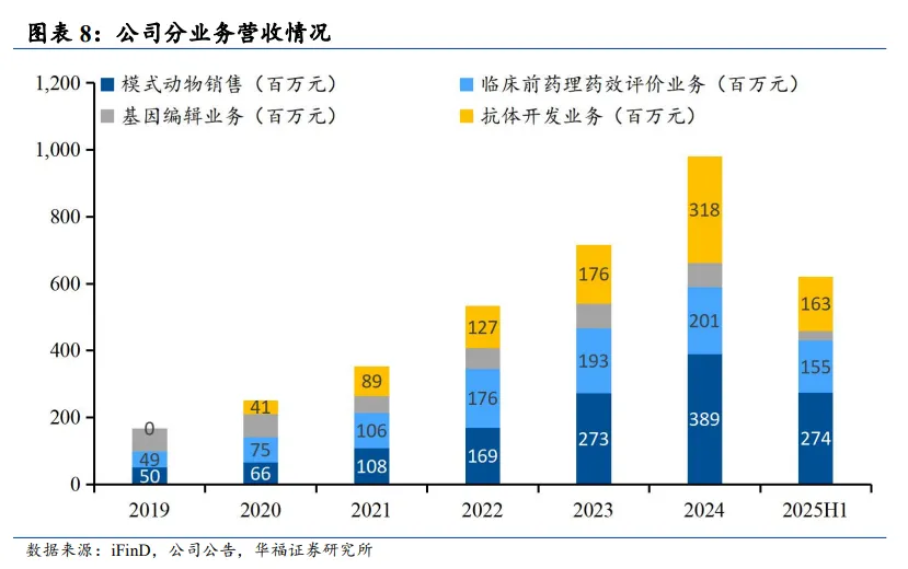 “抗体分子转让”(卖源头资产):2025年上半年收入1.63亿元,同比增长38%;“靶点人源化小鼠”(卖顶级药物评价工具):2025年上半年收入2.74亿元,同比增长56.1%,这部分的毛利率高达79%。