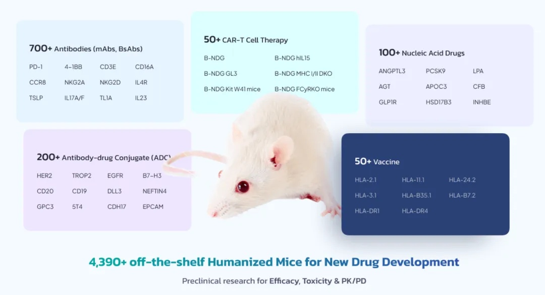 大规模靶点人源化小鼠:解决了“验证”问题。拥有1700+种靶点人源化模型,可以在临床前阶段就完成高精度的体内药效验证,大幅降低临床失败率。