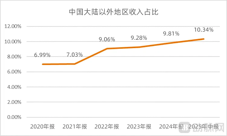 而且对医疗器械领域而言,海外市场有着更为广阔的发展空间。康基医疗近几年通过加大产品在海外市场的注册,把自主品牌推向了欧洲、中东等核心市场。过去的五年间,康基医疗在中国大陆以外地区的收入占比持续提升,2025年上半年已经达到了10.34%,国际化的成果已经显现出来。