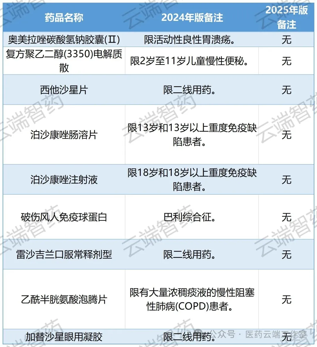 值得关注的有9个品种,其在医保目录备注栏与上一版对照,备注内容已经被删除,这意味着这些品种在医保支付的限制性条件被解除,也就是业界俗称的“解限”。