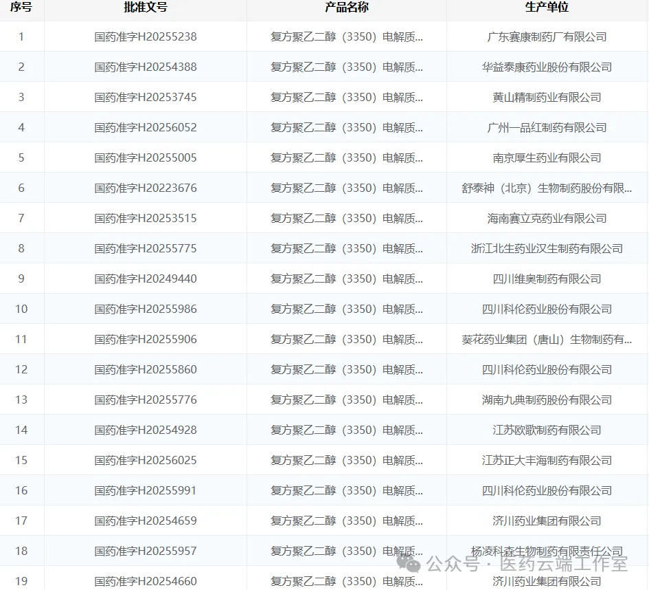 复方聚乙二醇(3350)电解质散今年国谈转常规目录,目前19个批文,大多数都是2025年新批。