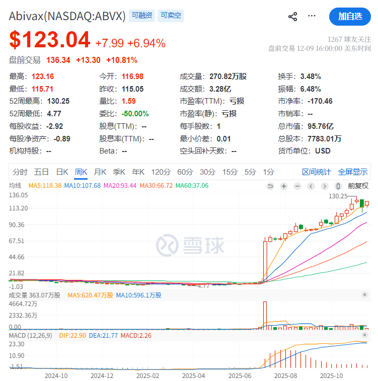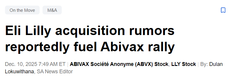 12月10日,据悉礼来有意收购法国生物技术公司Abivax,后者股价盘前大涨10.8%,最新市值已经超100亿美元,今年7月后股价暴涨10倍。