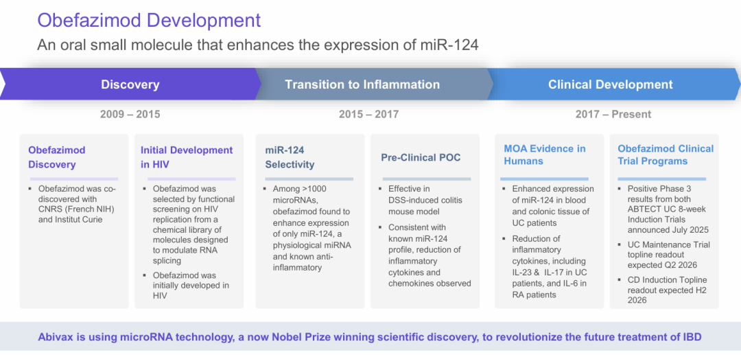 Obefazimod是一种经过化学优化的“首创(first-in-class)”口服小分子药物。其核心设计理念是靶向并调节细胞内的RNA生物学过程,而非传统的蛋白质靶点。这种基于RNA调控的策略,使其能够影响到更为上游和基础的生命活动,从而可能产生更持久和广泛的治疗效果。