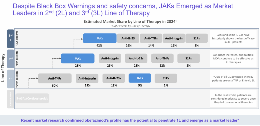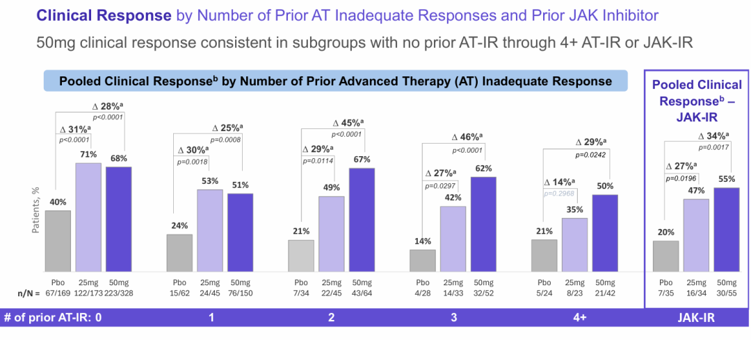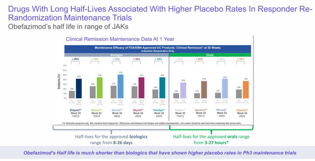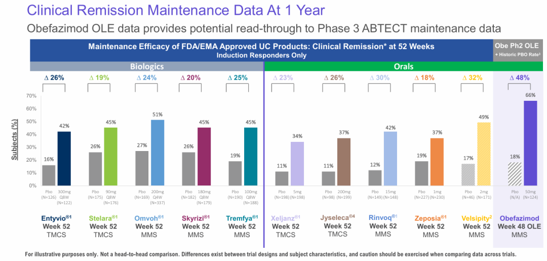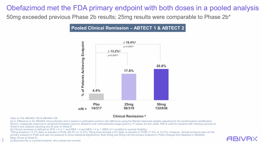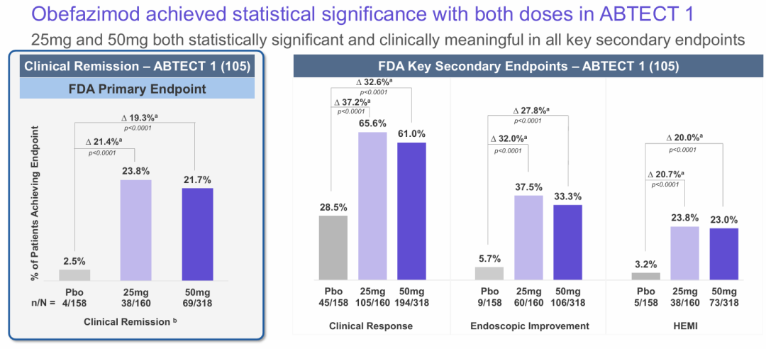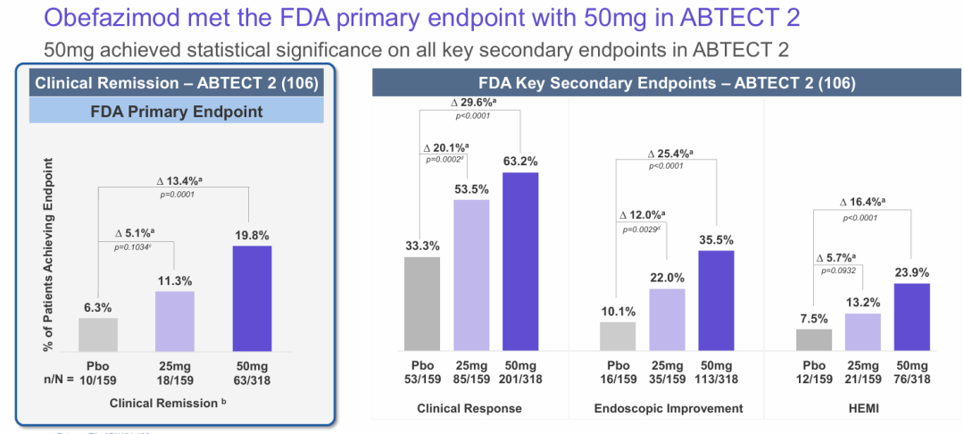 obefazimod的患者中,47.6%在第8周没有夜间排便(NBM),而安慰剂组为24.7%(23.1,p<0.00011)。在50mg组中,17.1%的患者在第8周用疲劳数值评定量表(NRS)测量疲劳缓解,而安慰剂组为7.7%(9.5,p=0.0011)。