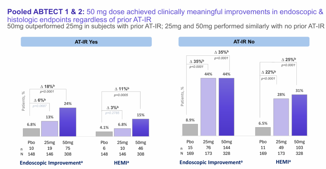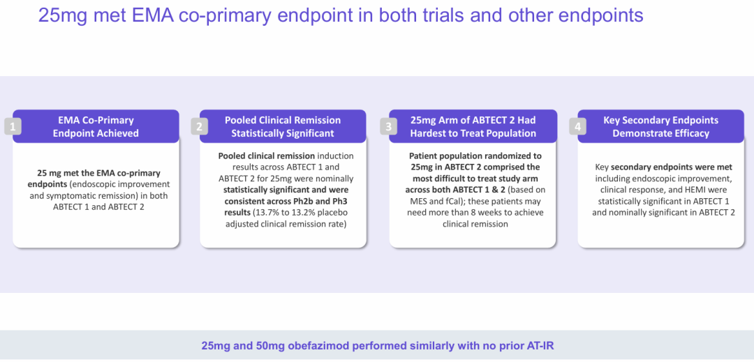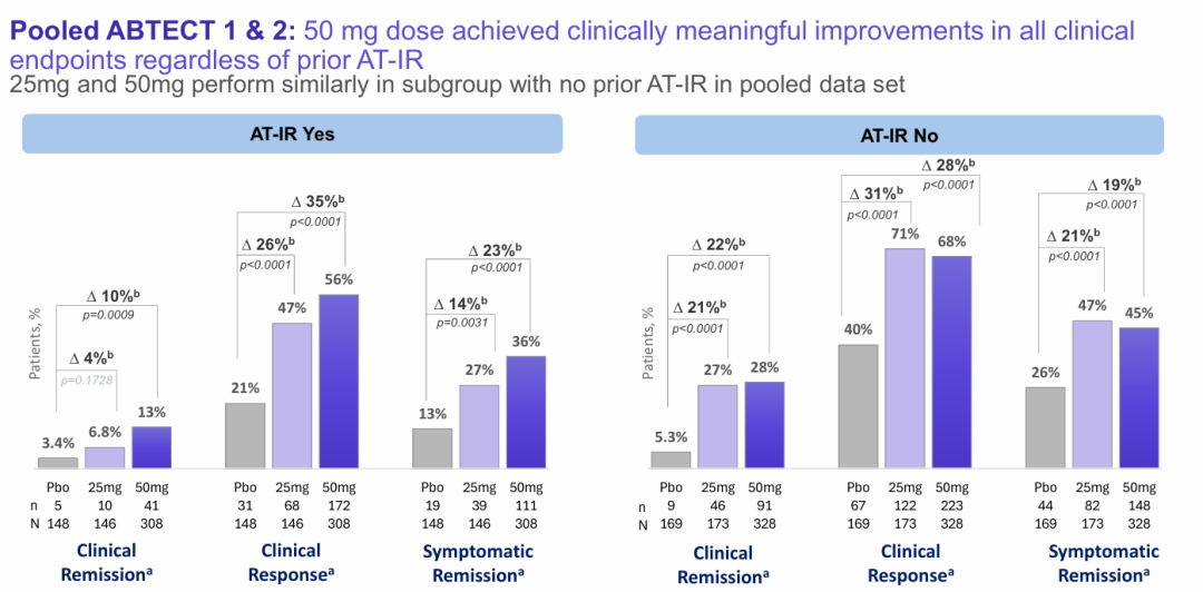 在ABTECT诱导试验中使用的所有PRO仪器中,从基线到第8周,观察到所有患者报告的结果(PRO)都有所改善,这些仪器评估了50mg和25mg每日一次的obefazimod的肠道紧迫性、睡眠中断、疲劳、生活质量和工作效率。在ABTECT