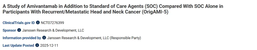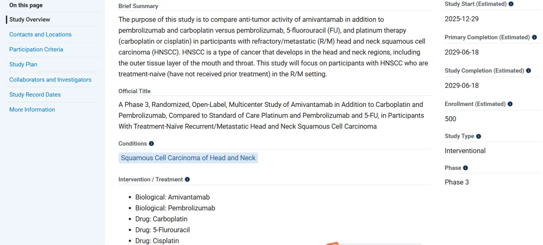 近日,根据UmabsDB数据库的记录,强生在clinical trials网站上,登记了一项EGFR/c-Met双抗药物Amivantamab,联合PD-1抗体药物Pembrolizumab及化疗Carboplatin,在一线头颈鳞癌受试者中,对比pembrolizumab+5-FU +carboplatin/cisplatin,启动了一项3期头对头临床试验OrigAMI-5(NCT07276399),该临床预计于2025年12月启动,入组人数为500例,这也是Amivantamab继非小细胞肺癌和结直肠癌后首次拓展到头颈鳞癌。