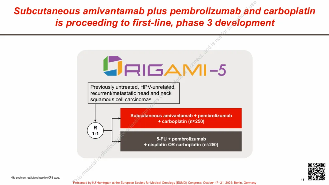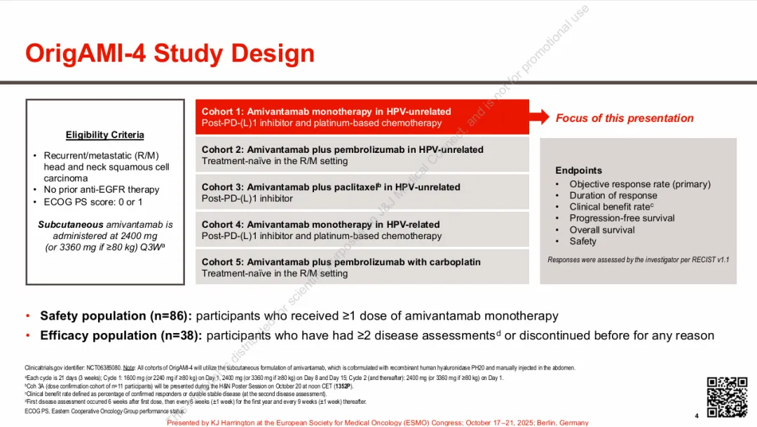 此前Amivantamab已经在复发转移性头颈部鳞状细胞癌启动了一项早期临床多队列试验试验OrigAMI-4,2025年ESMO会议期间,首次报道了Amivantamab单药治疗HPV无关的,免疫治疗及铂类药物失败后复发转移性头颈部鳞状细胞癌患者的队列数据。