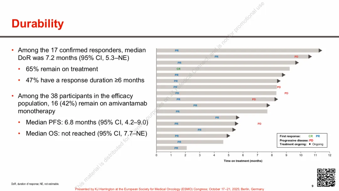 17例确认响应的患者中的中位DOR达到7.2个月,中位PFS达到6.8个月。Amivantamab在ORR和PFS方面均实现了成倍提升,不仅展现出优于传统EGFR单抗的疗效,也提示了双靶点药物在克服耐药和协同增效方面的潜力