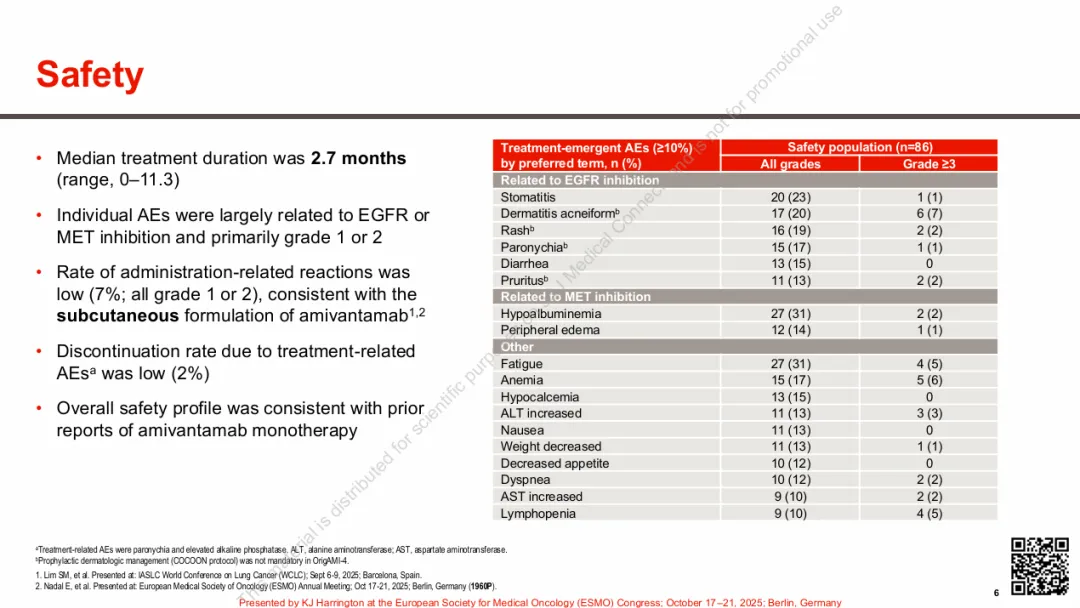 安全性方面,Amivantamab皮下给药显著减少相关治疗副作用,基于治疗相关的AE终止治疗率仅为2%,其他安全性事件与以往一致。