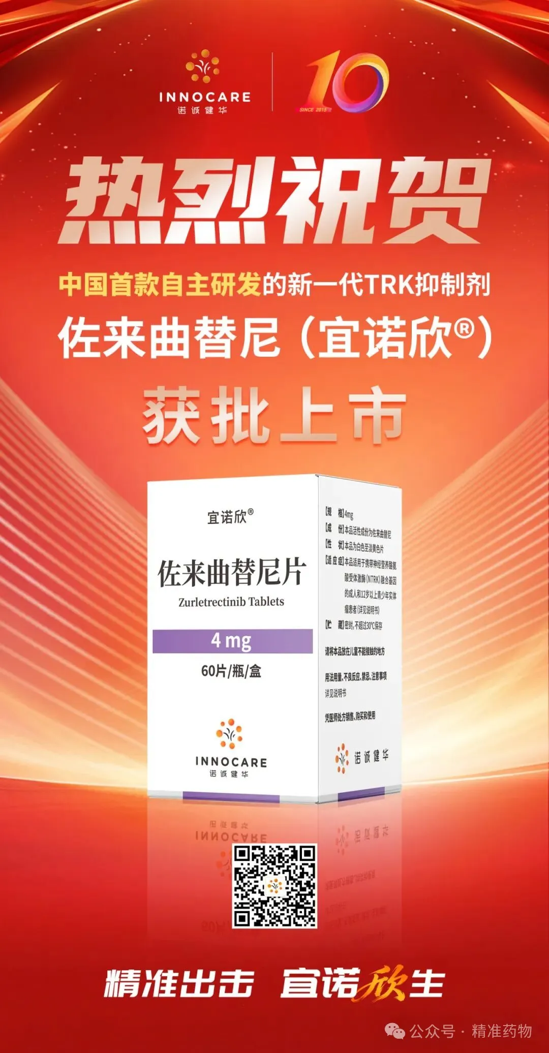 诺诚健华(上交所代码:688428;香港联交所代码:09969)今天宣布,公司自主研发的新一代TRK抑制剂宜诺欣®(佐来曲替尼,ICP-723)获得中国国家药品监督管理局(NMPA)批准,用于治疗携带NTRK融合基因的成人和12岁以上青少年实体瘤患者。这标志着中国首款自主研发的新一代TRK抑制剂获批上市。