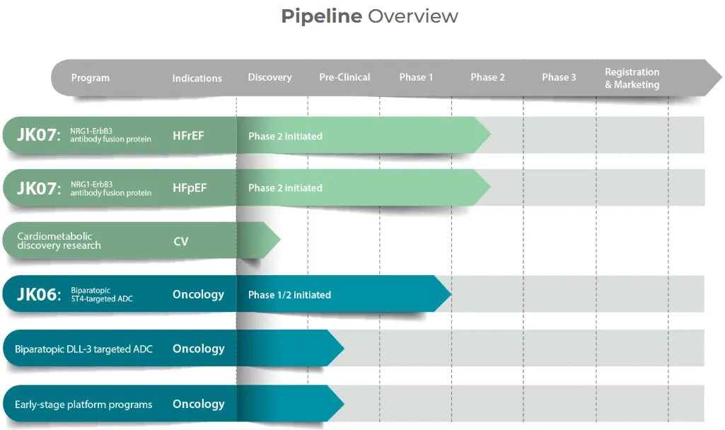 目前,SalubrisBio有6个在研管线,其中3个已进入临床阶段:JK07(中国项目代码:SAL007),用于治疗HFrEF和HFpEF;JK06,一款用于治疗肿瘤的5T4 ADC药物。