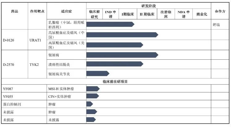 Taragarestrant(D-0502)是其自主研发的一款口服选择性雌激素受体降解剂(SERD),用于治疗雌激素受体(ER)阳性、人表皮生长因子受体2(HER2)阴性的乳腺癌;D-0120是一款尿酸盐转运体1(URAT1)抑制剂,用于治疗高尿酸血症及痛风;D-2570是一款靶向TYK2的新型口服选择性抑制剂,用于治疗银屑病等自身免疫性疾病。