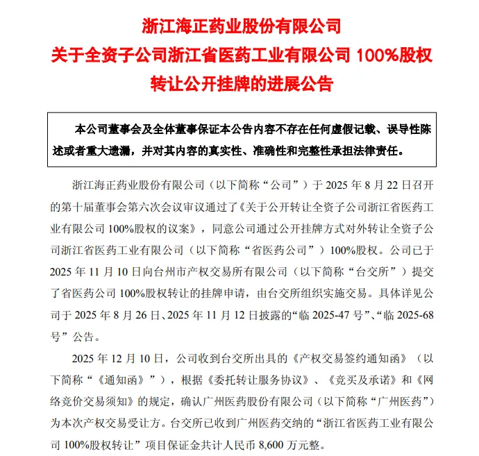 12月10日,海正药业公告,其全资子公司“浙江省医药工业有限公司”100%股权转让事项已确定受让方为广州医药。目前,已收到广州医药交纳的 “浙江省医药工业有限公司100%股权转让”项目保证金共计8600万元。此次股权转让成交价格最终确定为5.005亿元。