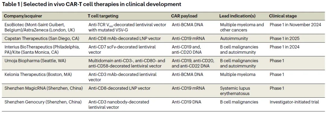 体内CAR-T疗法提供了一种诱人的简单替代方案:利用慢病毒载体或者LNP-RNA技术将CAR的“遗传指令”直接递送到患者体内,让CAR-T细胞在患者体内直接产生。与体外生成CAR-T相比,体内CAR-T治疗患者无需清淋(保留了患者的免疫系统,提升了安全性)、生产更简单、现货、治疗流程简化。“拥有一种真正现货型药物,就像可以在门诊使用的产品一样,是我们的梦想。”Capstan的Haig Aghajanian说道。