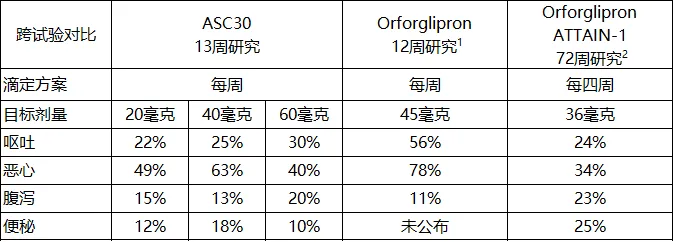 图2 每周滴定ASC30和orforglipron的胃肠道不良反应对比