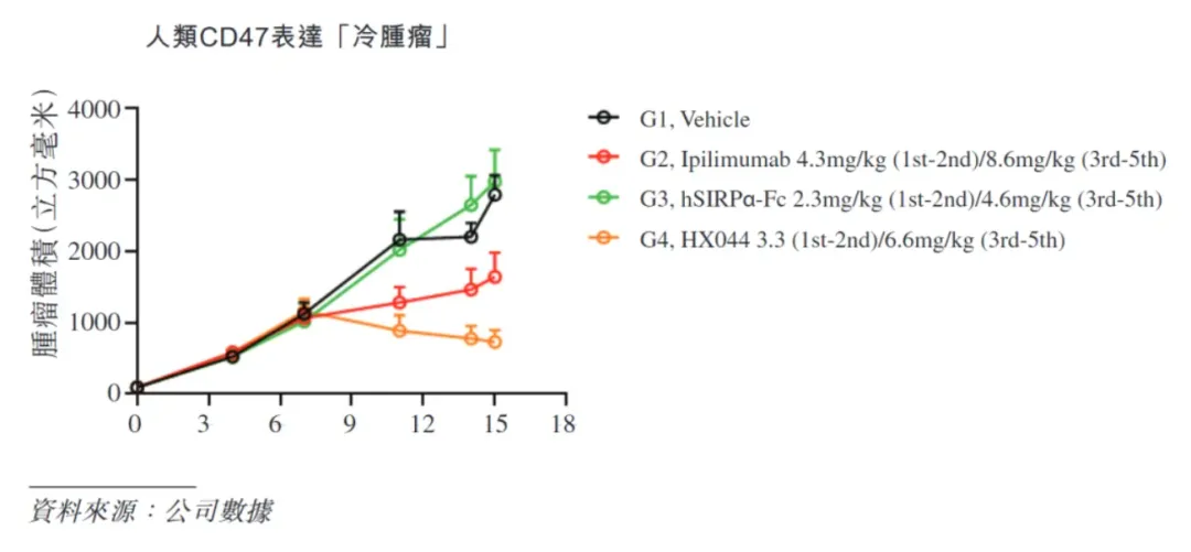 3)临床前/同靶点体外数据初露峥嵘:低剂量的HX044抗肿瘤能力较Y药更强,治疗窗口也更广,并且在CD47表达的热肿瘤、冷肿瘤模型中都具备强抗肿瘤活性。另外,北大傅阳心团队一项anti-CTLA-4/SIRPα体外试验也证明了这一策略的安全性潜力。