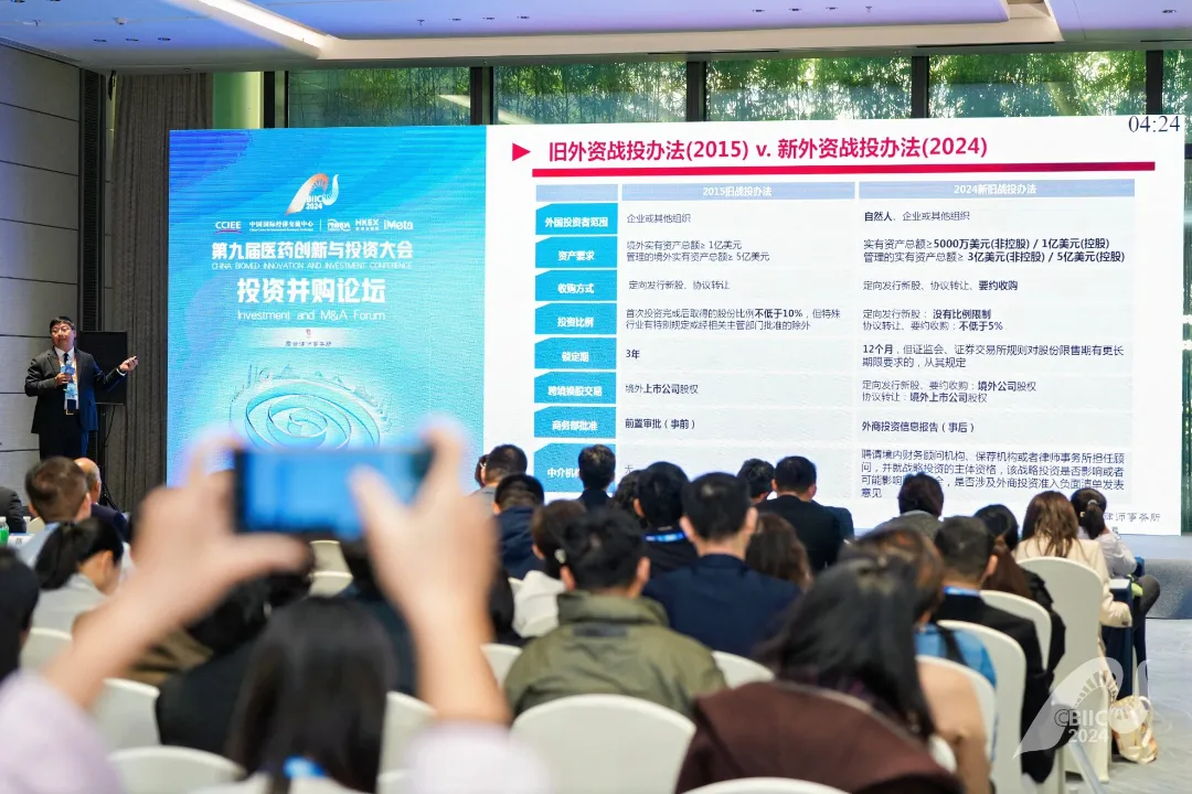 君合律师事务所资深合伙人、医药医疗业务部主管陶旭东为现场观众带来“2024药械投资并购新法规与新案例解析”主题报告。自2023年下半年以来,受“退出渠道缺乏”因素影响,叠加A股科创板标准调整等原因,投融资市场整体低迷。在此背景下,陶旭东根据自身经验,结合君合参与的典型案例,为在场听众讲解要点。他表示,从企业角度,上半年的确经历了艰难的时刻。目前,国家出台的“外资战投新规”“科创板八条”“并购六条”等系列政策,市场正逐步回暖,但仍需注意寒冬未过,市场依旧在持续发展变化。