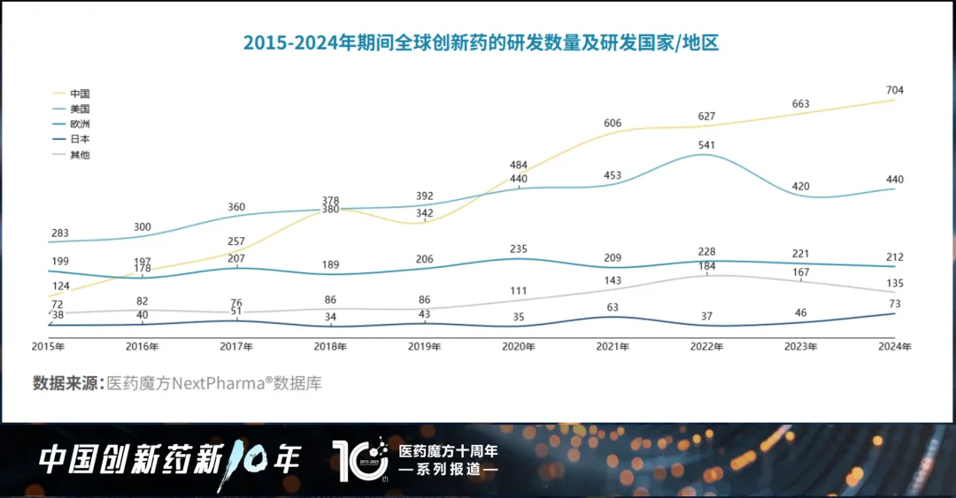 2015-2024年期间全球首次开展临床试验的创新药数量及研发国家/地区(数据来源:医药魔方NextPharma®数据库)