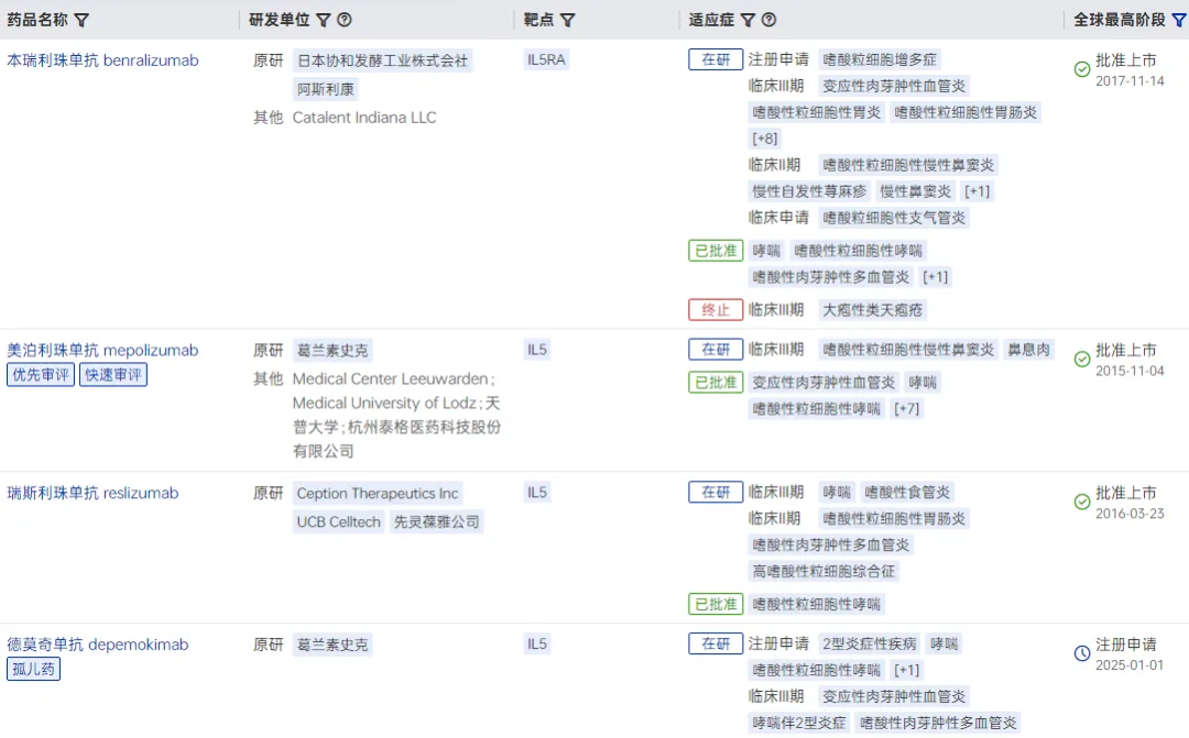 目前,基于该靶点已有4款生物药上市,用于治疗哮喘等嗜酸性粒细胞相关疾病,包括reslizumab、阿斯利康的benralizumab、GSK的mepolizumab和depemokimab。