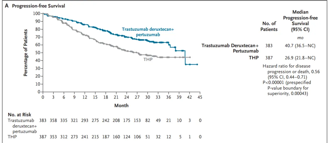 患者按1:1:1随机分配至三组,核心对比组为联合组(T-DXd+帕妥珠单抗组,n=383)和标准治疗THP组(紫杉类药物+曲妥珠单抗+帕妥珠单抗,n=387),均为每3周静脉输注一次,直至疾病进展或不可耐受毒性。主要终点为无进展生存期(PFS),次要终点包括客观缓解率(ORR)与缓解持续时间(DoR)等。