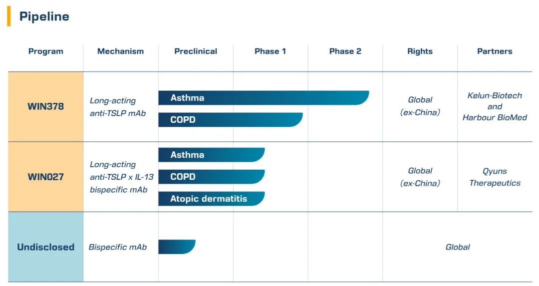Windward Bio是一家处于临床阶段的生物科技公司,拥有深厚的发现、开发及商业化专业知识,致力于改变晚期免疫疾病患者的治疗方式。其领先项目为WIN378,一种潜在同类最佳的长效抗TSLP单克隆抗体,目前正针对哮喘进行II期临床试验。研发管线亦包括处于临床阶段的长效抗TSLPxIL-13双特异性抗体WIN027,其在各种免疫疾病中具有潜在广泛的治疗应用。该公司正在建立长效双特异性抗体研发管线,针对呼吸道及皮肤疾病中已验证的生物学机制。