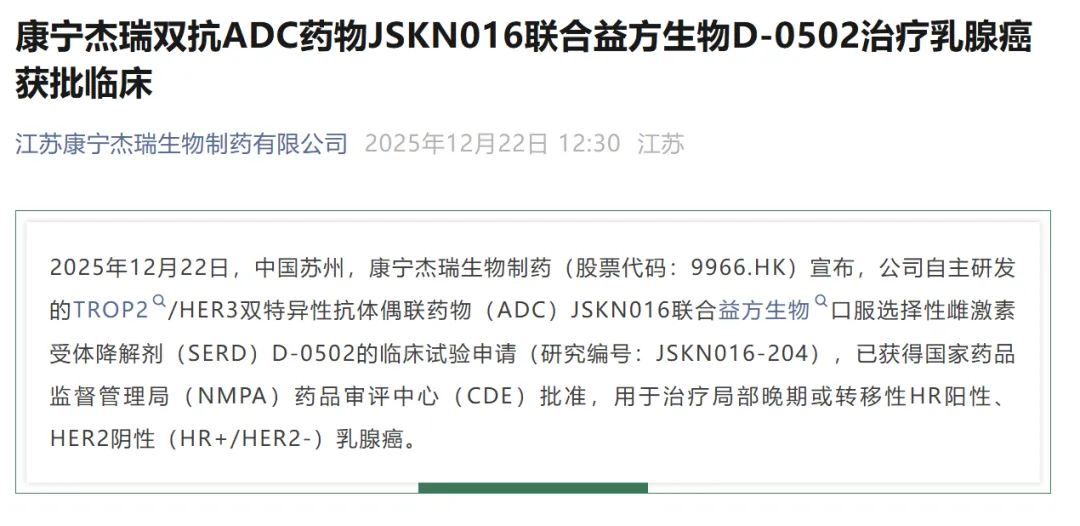 全球唯一一款同时靶向TROP2/HER3的ADC药物JSKN016,聚焦乳腺癌和肺癌两大瘤种,计划2026年公布非小细胞肺癌(NSCLC)联用数据,并加速启动III期注册临床。12月22日,JSKN016获NMPA批准,联合益方生物口服选择性雌激素受体降解剂(SERD)D-0502,用于治疗局部晚期或转移性HR阳性、HER2阴性(HR+/HER2-)乳腺癌患者。