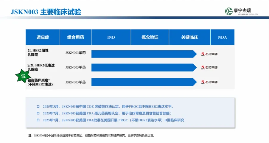 更好的血清稳定性、更低的血液学毒性、更强的肿瘤抑制和旁观者杀伤效应,显著扩大了JSKN003的治疗窗。JSKN003可以不限HER2表达水平,覆盖更广泛的患者群体,已在多个高发癌种中展现出临床潜力,并获中美双突破性疗法认定,正在推进四项III期临床研究。