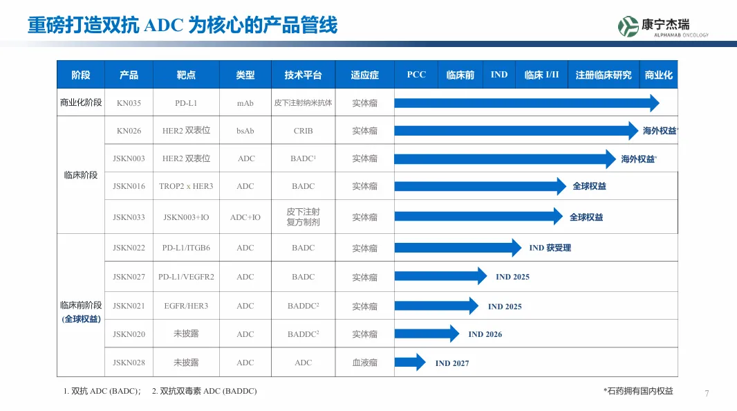 在双抗ADC领域,康宁杰瑞布局了不下6条管线,涵盖HER2、TROP2、EGFR、αvβ6等多个靶点,未来两年将步入临床密集爆发期。