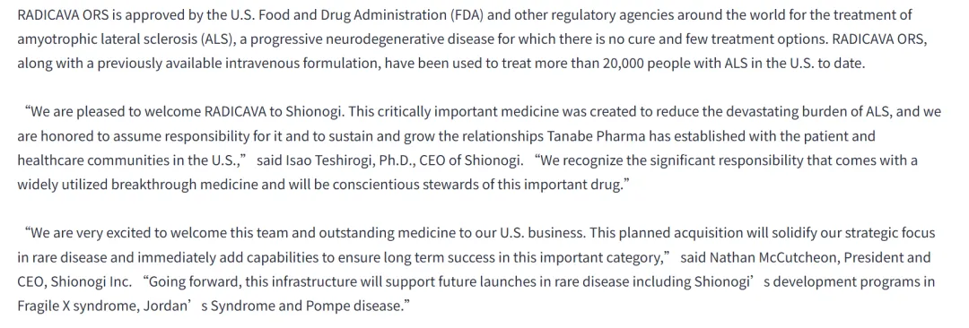 盐野义通过本次交易将RADICAVA系列产品纳入业务体系,将进一步完善中枢神经系统治疗药物管线,响应未被满足的医疗需求,同时推进全球医药业务基础的强化。未来,公司将充分发挥该产品的既有价值,同时探索新适应症开发等潜在可能性,致力于为更多患者提供支持。