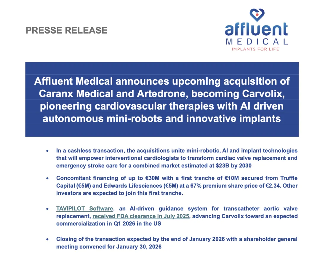 近日,Affluent Medical宣布,已分别与 Caranx Medical和 Artedrone达成收购协议。交易完成后,Affluent 计划将三家公司整合为一家全新的心血管与神经介入技术平台公司——Carvolix。