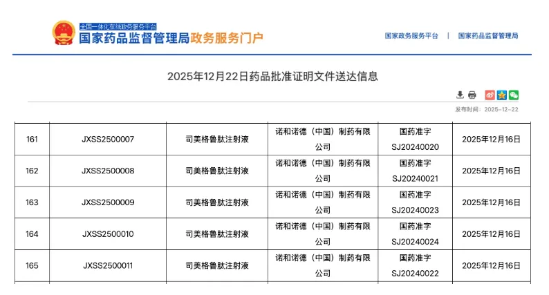2025 年 12 月 22 日,国家药品监督管理局(NMPA)官网显示,司美格鲁肽注射液(商品名:诺和盈 ®)的心血管适应症上市申请获得批准,适用于降低已确诊为心血管疾病且 BMI≥27 kg/m² 成人患者的主要心血管不良事件(心血管死亡、非致死性心肌梗死、非致死性卒中)的风险 。这一批准,标志着司美格鲁肽在疾病治疗领域实现了重大跨越,从单纯的减重药物,逐步转变为心血管疾病防治的重要武器。