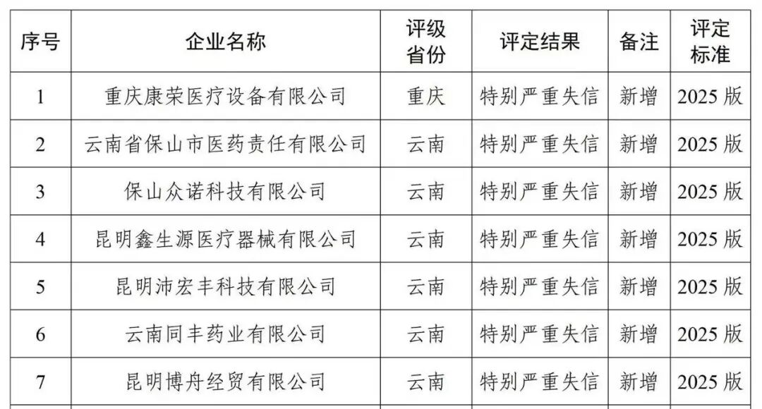 在最新公布的“特别严重(失信)”企业中,新增7家企业里云南企业占据6席;与此同时,另有4家企业被列入“严重(失信)”等级,分别适用2020版与2025版裁量基准。这也是医保局自今年6月修订招采信用评价制度以来,首次以“新旧规则并行”的方式,对失信行为进行集中披露。