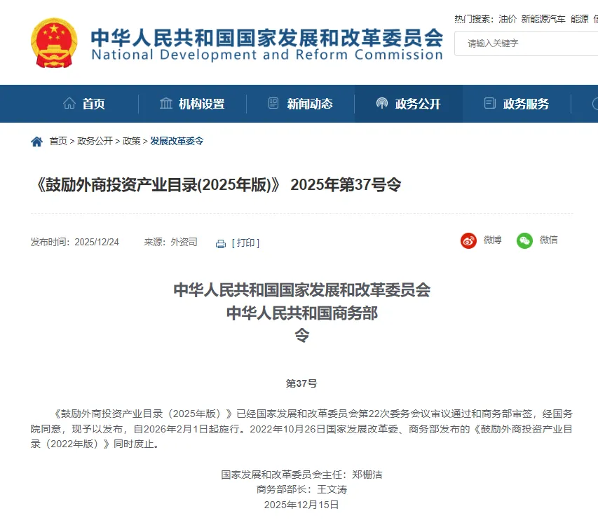 2025 年 12 月 24 日,国家发展改革委联合商务部发布《鼓励外商投资产业目录(2025 年版)》,自 2026 年 2 月 1 日起施行。