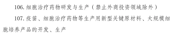 目录第 106 条:细胞治疗药物研发与生产(禁止外商投资领域除外)