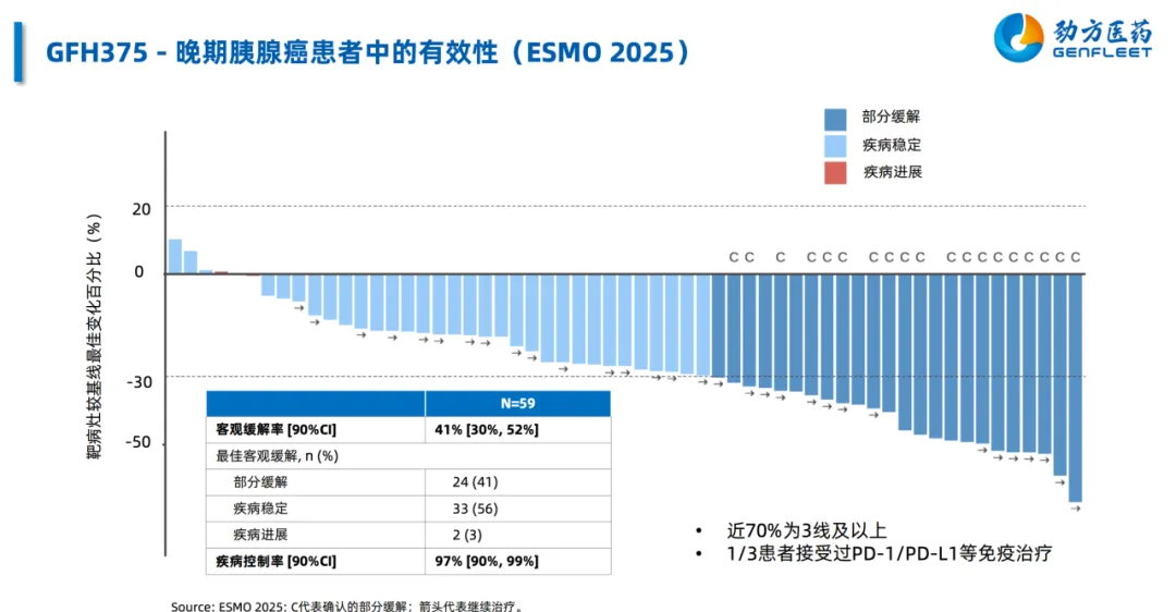GFH375在胰腺癌中展现了自身惊艳的疗效。注意,这可不是一线治疗胰腺癌的数据,其中70%的患者接受了三线及以上的治疗,且1/3的患者接受过PD-1/PD-L1等免疫治疗。最后我们也看见了DCR达到了97%,仅有两人出现疾病进展,而ORR达到了41%,这对于后线治疗胰腺癌的数据来说无疑是相当振奋人心的。