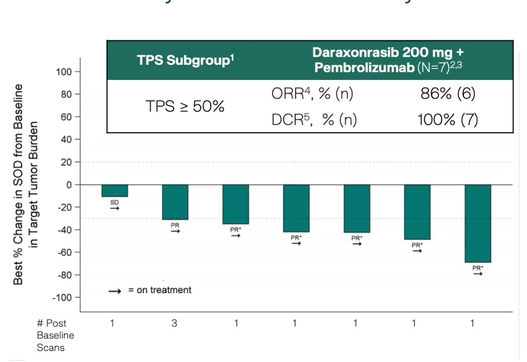 除此之外,RMG-6236还尝试与帕博利珠单抗与化疗联用用于一线治疗,如下图所示,在TPS≥50%的PD-L1阳性患者中,该联合疗法的ORR达到了86%,7名患者中有6名缓解。