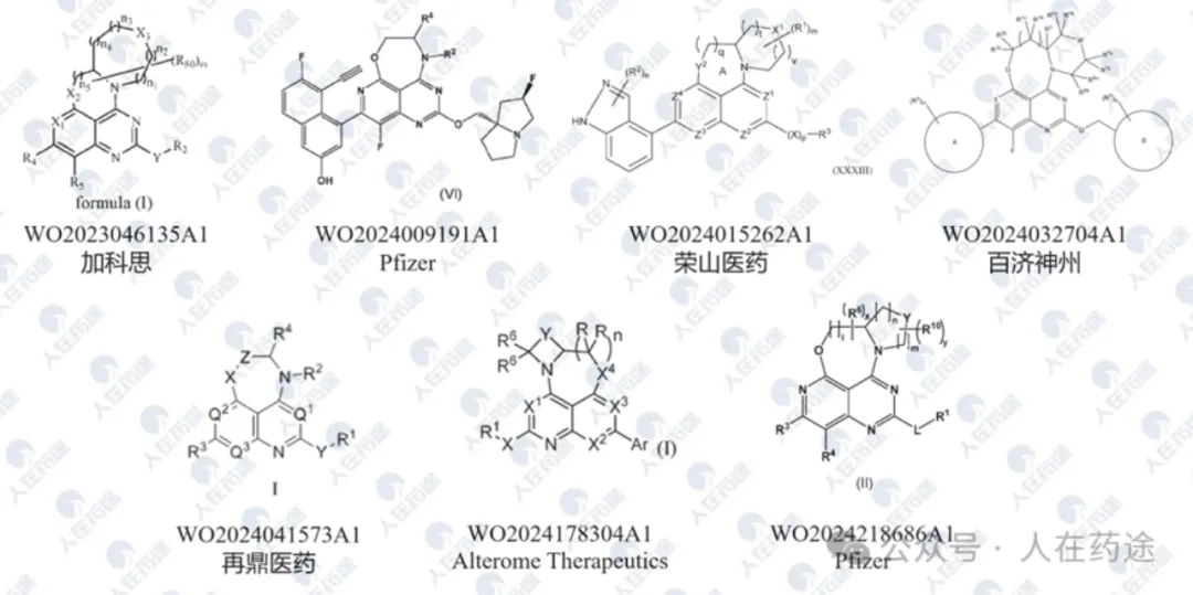 而刚刚出海的加科思分子JAB-23E73结构上也不是对上述两种结构的follow,根据人在药途公众号整理的图片,其实如下图所示,大多数pan-Kras抑制剂的专利结构大多都包含了一个七元环以上的大环,其中也包括辉瑞在加科思之后披露的专利结构。