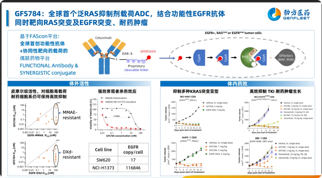 除此之外,GFS784恐怕是劲方目前最有潜力的管线,它是全球首个pas-RAS抑制剂载荷ADC,用的单抗是EGFR单抗,可同时靶向RAS突变和EGFR突变,这个载荷非常具有创新性,目前能看到它在对MMAE和DXD耐药的细胞系中仍能保持高效抑制,且具有强效的旁观者效应。