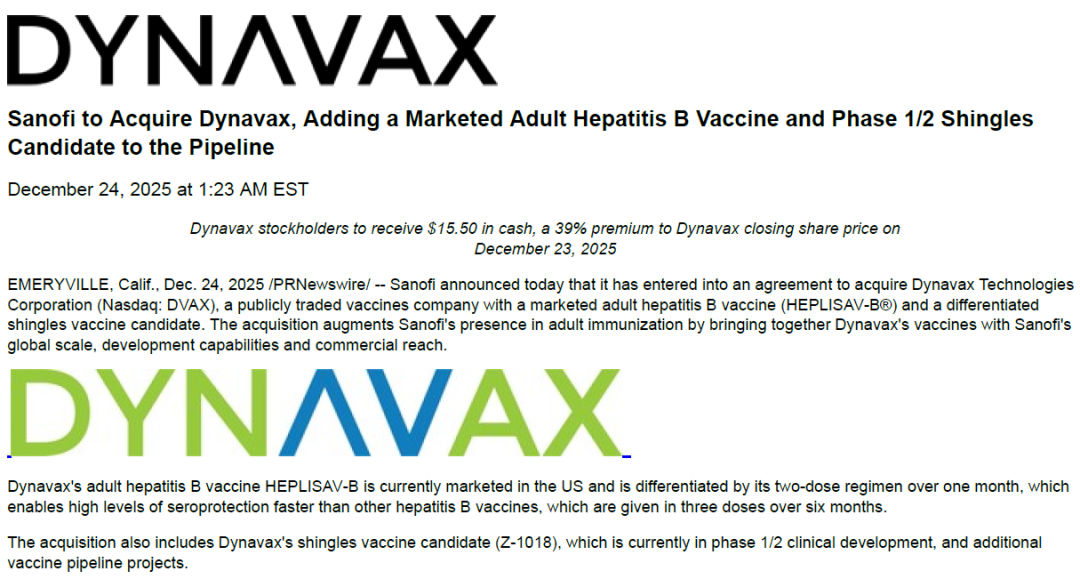 2025年12月24日,赛诺菲与Dynavax达成收购协议,交易对价为22亿美元。