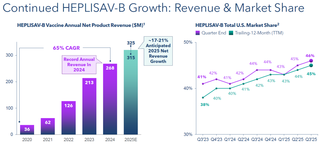 Dynavax乙肝疫苗上市后稳定增长,2024年销售额2.68亿美元,2025年预计销售额3.15亿美元。